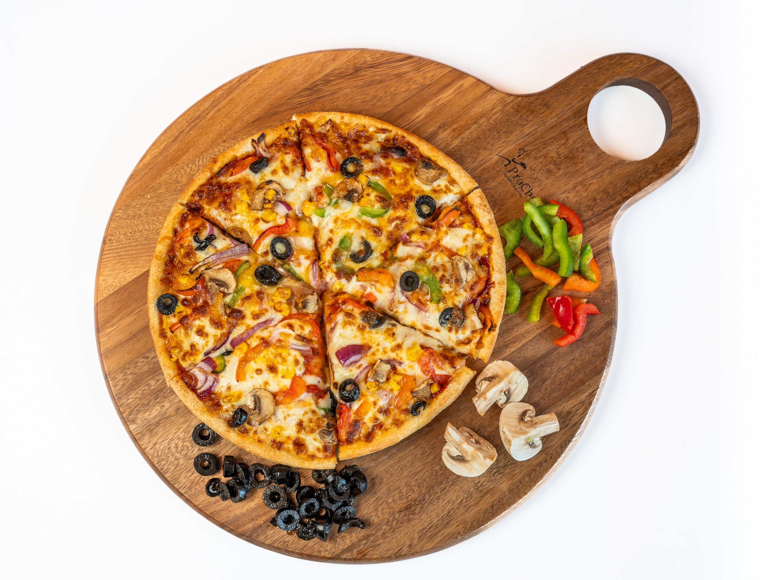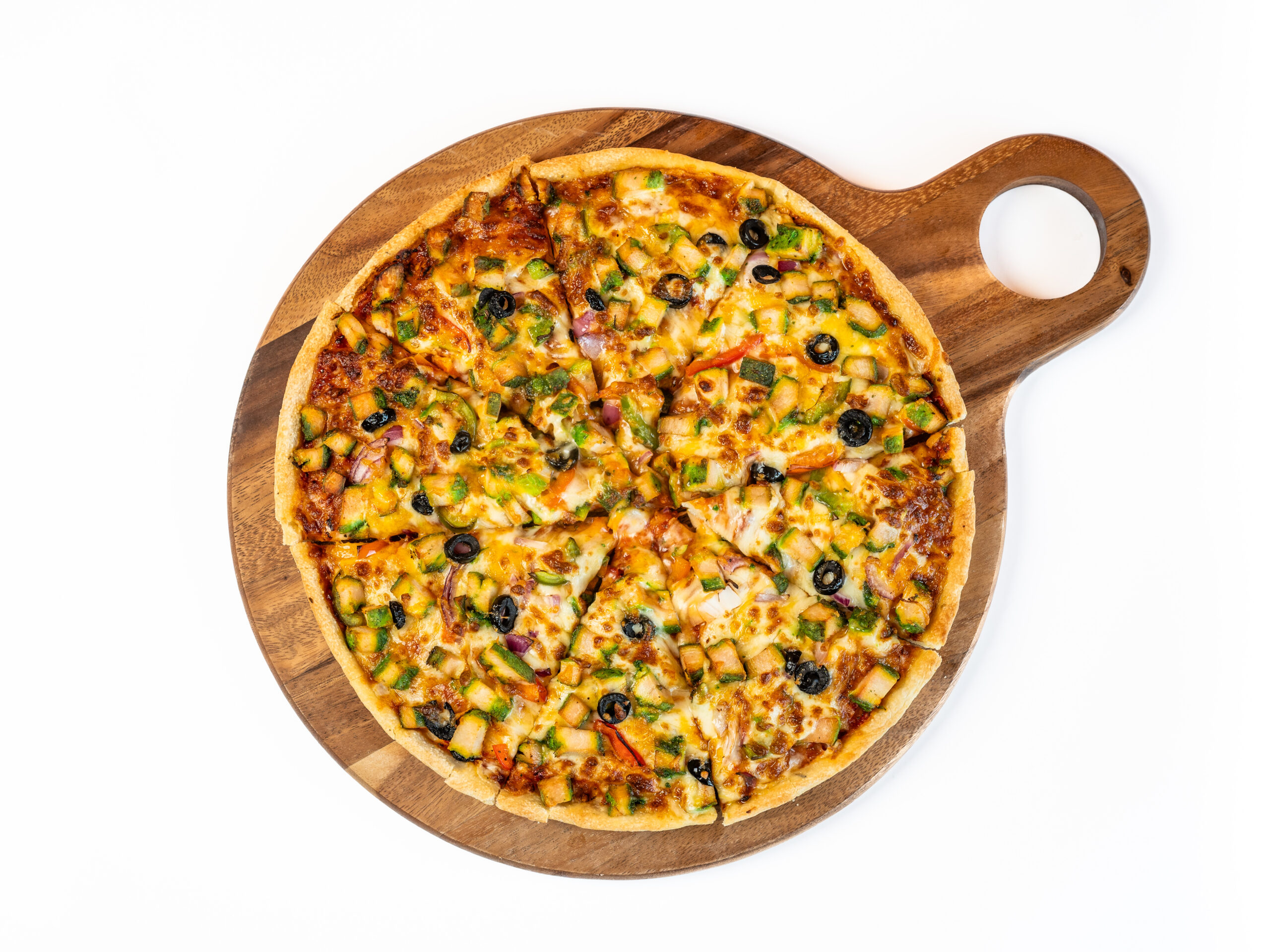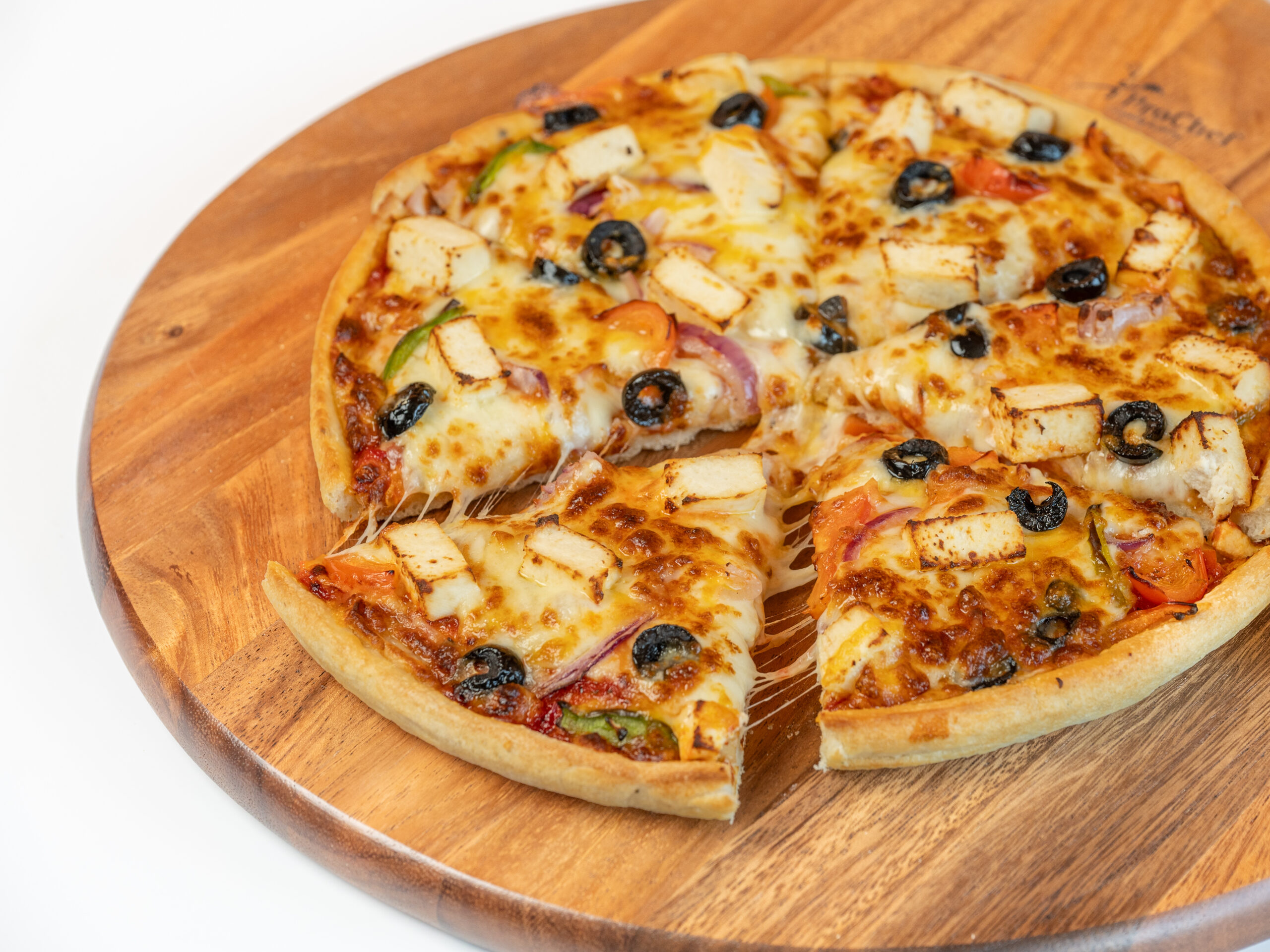 Bell pepers, Cheese, House sauce, Green olives, Onion, Tandoori paneer