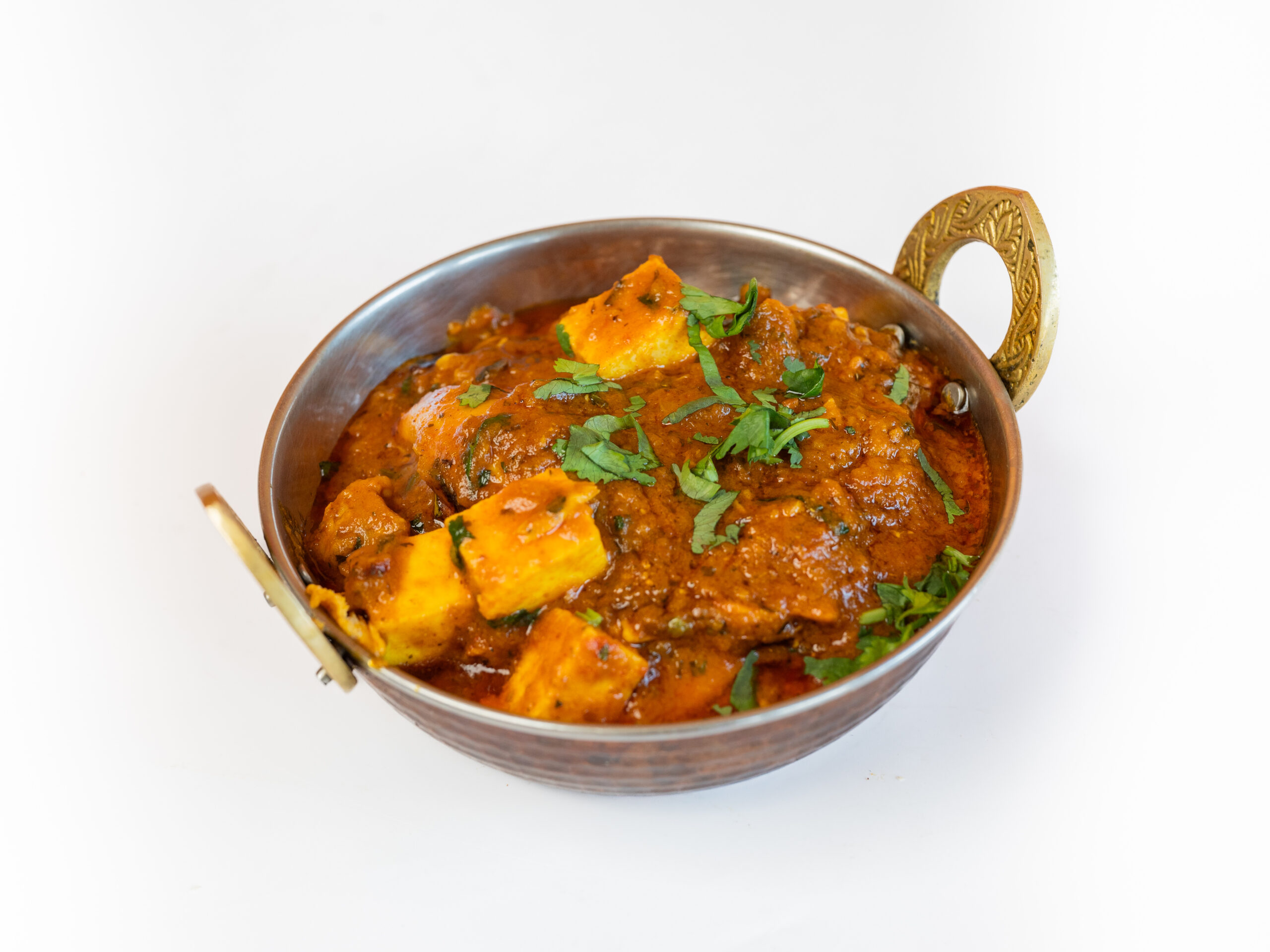Cottage cheese en kip in tomatensaus met verse koriander en room.