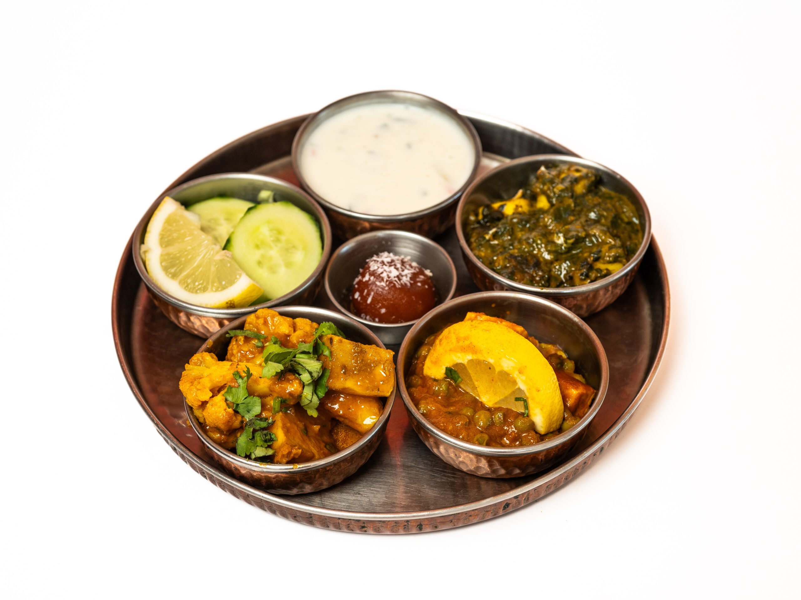Chicken samosa with Mint Chutney Lamb Biryani Fresh Salad Raita Gulab Jamun Mango Lassi